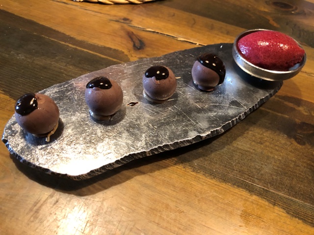 Bombones líquidos de chocolate con sorbete de grosella negra