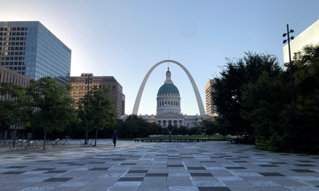 Desde el parque hay unas vistas estupendas del arco pasando por encima del Old Courthouse mientras el sol esta apareciendo tras ellos, como era tan temprano estábamos prácticamente solos, a excepción de algún vagabundo y del personal de limpieza .