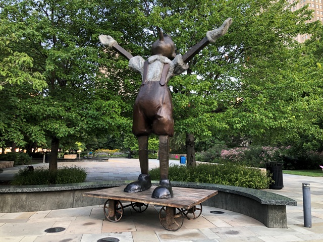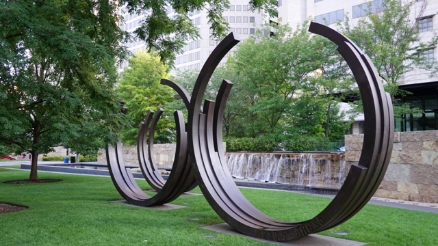 Atravesamos el Kiener Plaza Park para dirigirnos hacia el Citygarden, un parque ajardinado con varias esculturas de arte urbano, tiene 24 esculturas originales y también dispone de relajantes fuentes.