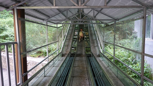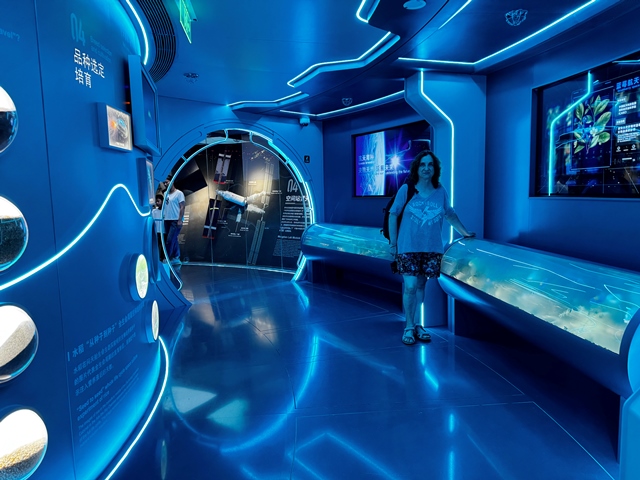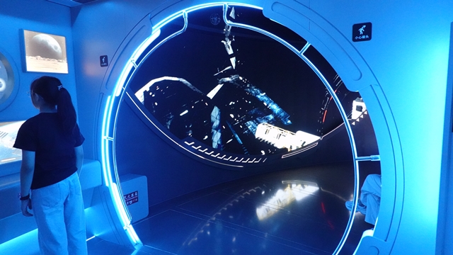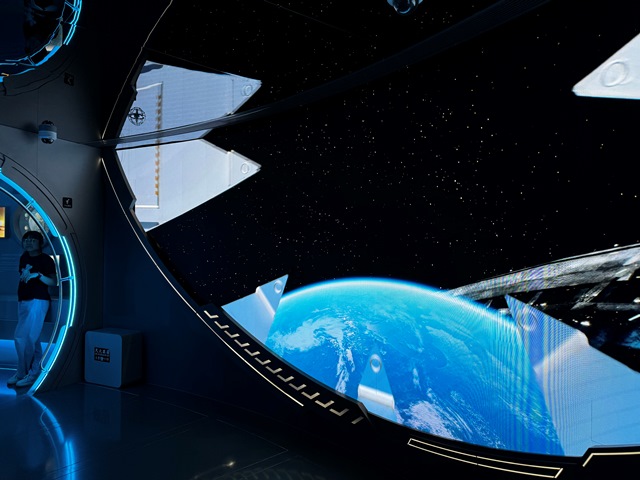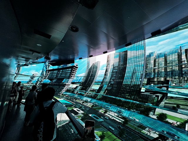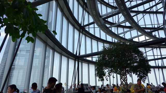 Nosotros empezamos por esfera del mirador donde hay varias zonas con el suelo de cristal, después subimos al modulo espacial y fuimos bajando pasado por todas las plantas, donde hay una zona de máquinas recreativas, otra con una montaña rusa virtual, una zona con presentaciones multimedia en una pantalla esférica gigante, un restaurante y mucho más.