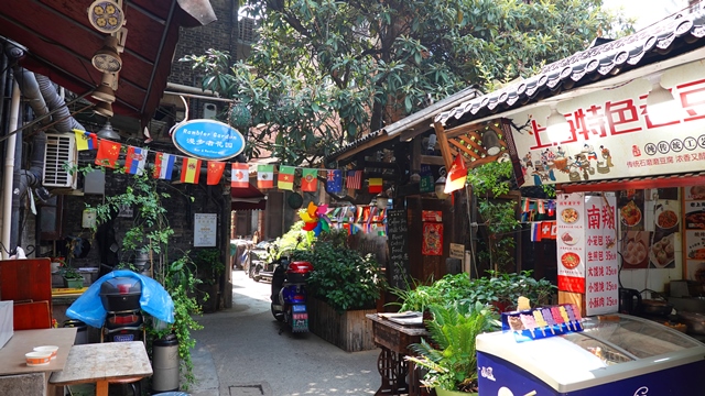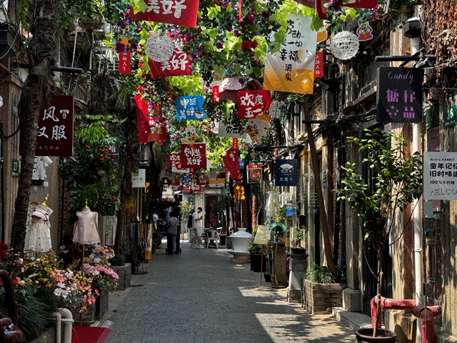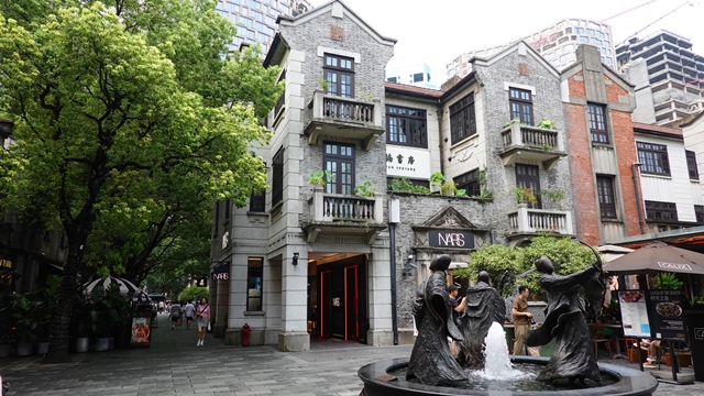 Aunque la zona más conocida del barrio es la parte de los callejones peatonales situados entre antiguas casas tradicionales del siglo XIX con fachadas de ladrillo llamadas shikumen, actualmente restauradas y ocupadas por librerías, restaurantes – cafés y tiendas de moda.