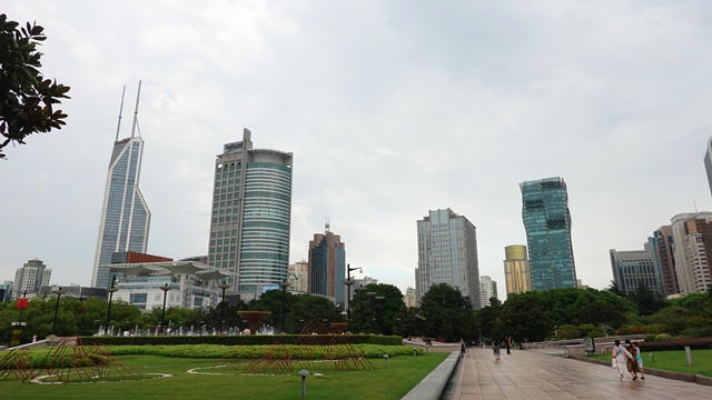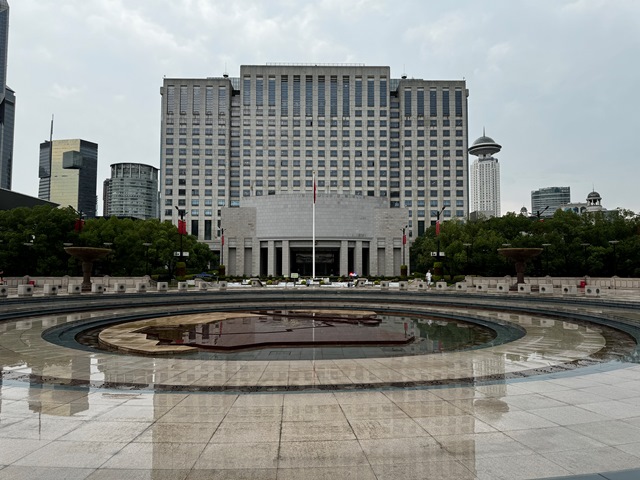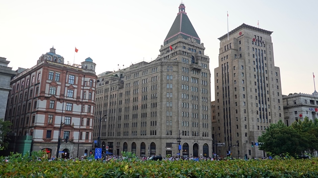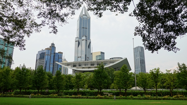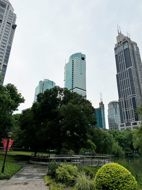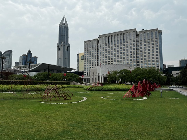 Una vez en la Plaza, pudimos ver varios edificios de interés alrededor de ella, como el Museo de Shanghái, inaugurado en 1996. El que fuera el edificio más alto de Asia hasta 1952 el Park Hotel Shanghái , la Jiangjiang Tower, el espléndido edificio del Gran Teatro de Shanghái diseñado por el arquitecto francés Jean-Marie Charpentier en colaboración con el Instituto de Diseño Arquitectónico del Este de China, inaugurado en 1998, el Centro de Exposiciones de Urbanismo de Shanghái , el Museo de Arte de Shanghái y Edificio del Gobierno de Shanghái, este último estaba rodeado de fuerzas de seguridad para protegerlo.