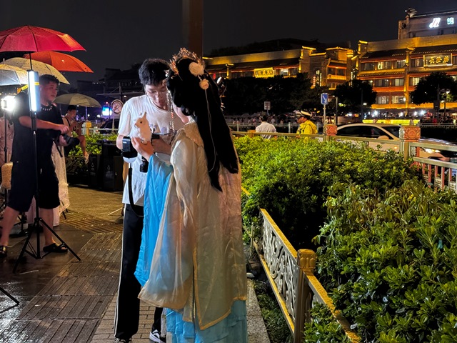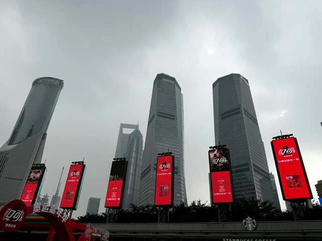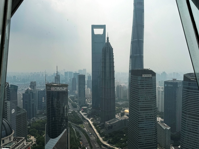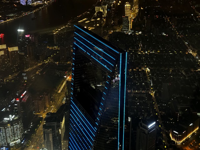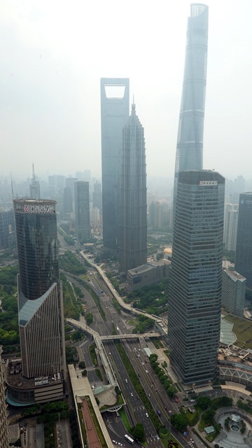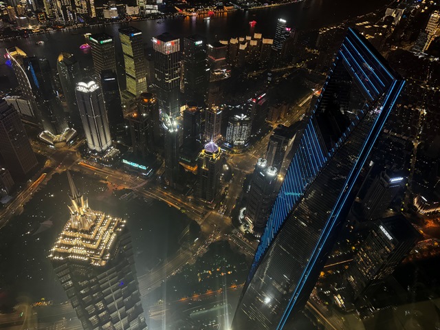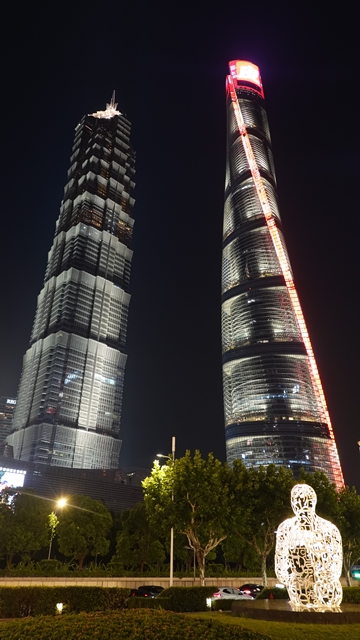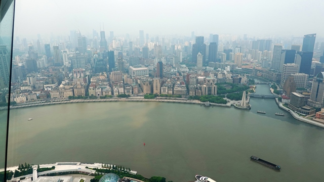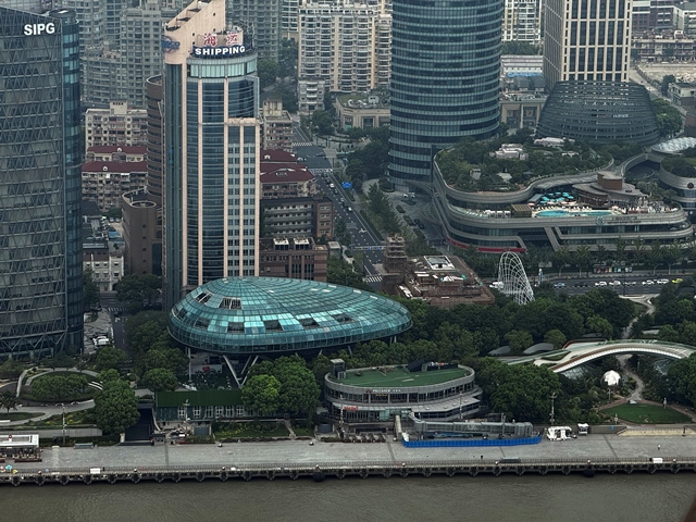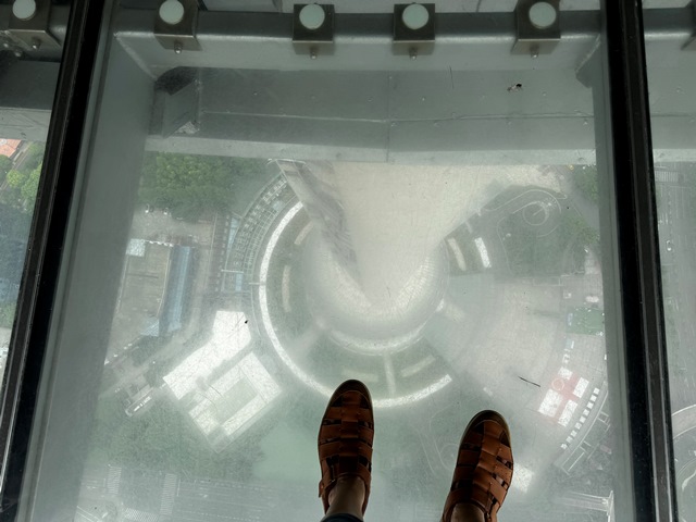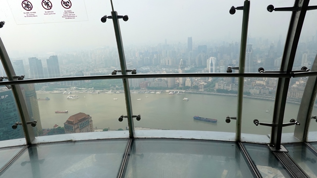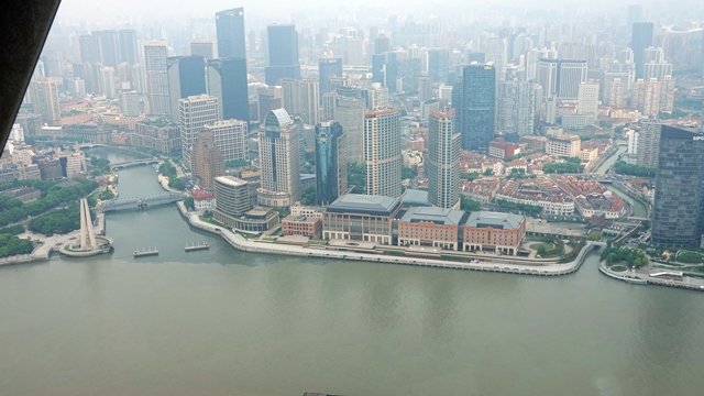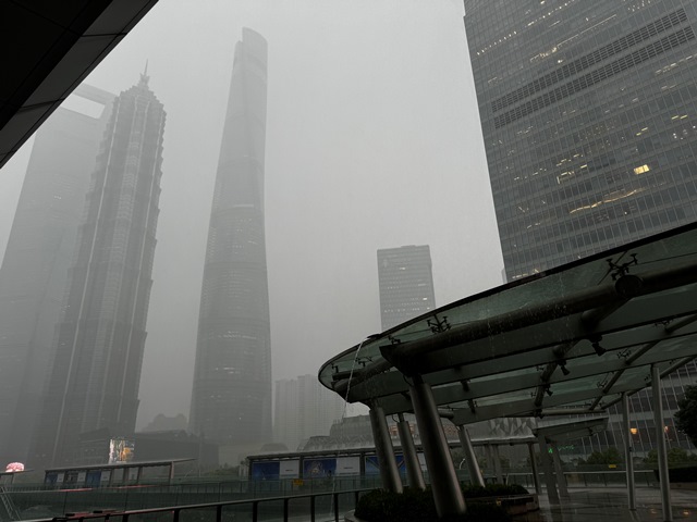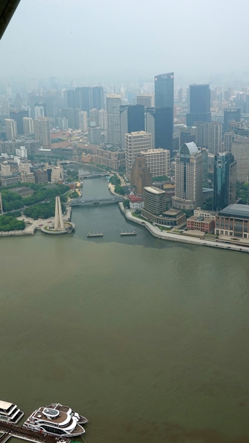 Cuando salimos de la torre, se estaba nublando bastante, empezando a lloviznar suavemente, tuvimos tiempo de hacer unas cuantas fotos desde la pasarela de la rotonda de Mingzhu y poco más pues empezó a diluviar.