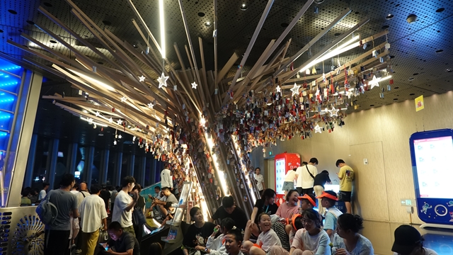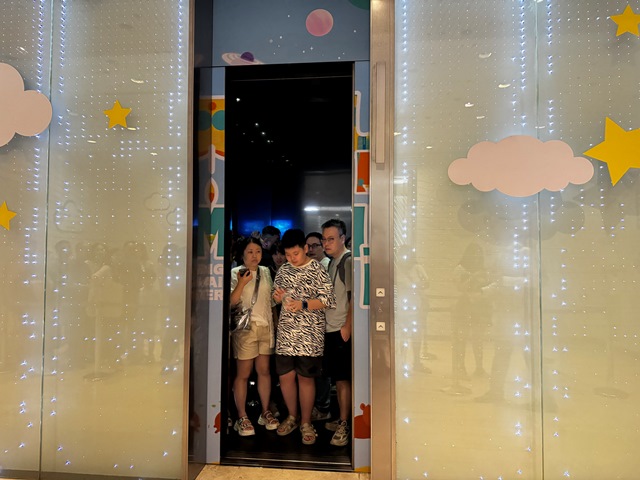 Salimos de la torre hasta la calle buscando el acceso correcto, que tras darle media vuelta al perímetro lo encontramos, allí vendían las entradas. Elegimos la que nos permitía subir hasta lo más alto, pero ya os adelanto que no vale la pena, porque tiene una ventana muy pequeña y lo único que hay es una zona temática, estilo nave espacial, con pantallas de video, creo que está más indicada para los niños que para adultos.