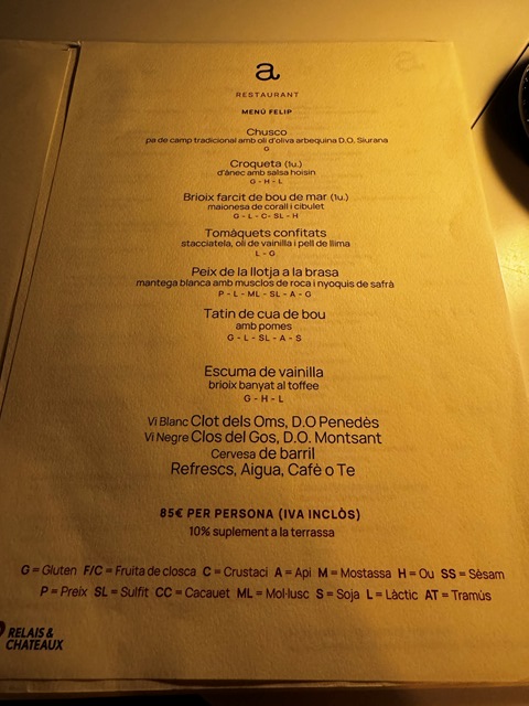 Ofrecen varios menús, en nuestro caso elegimos el Menú «Felip», que incluía el maridaje de vinos y el café por un precio de 85€.