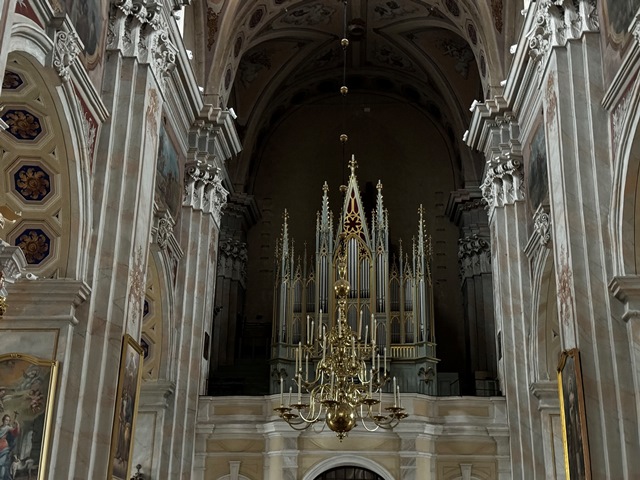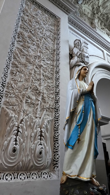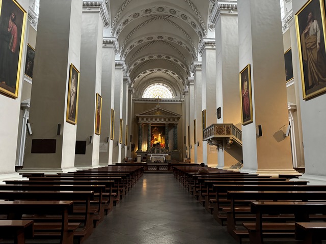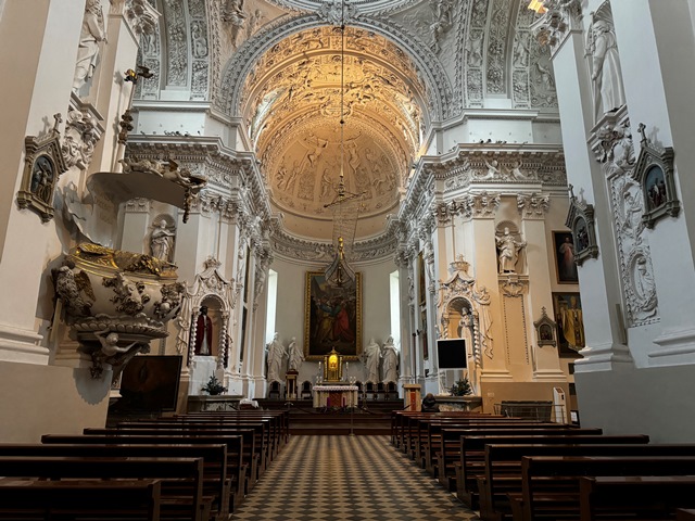 En su interior pudimos admirar una gran variedad de trabajos en estuco, destacando el elaborado pulpito y la vertiginosa cúpula situada en el cruza de la nave central y el transepto.