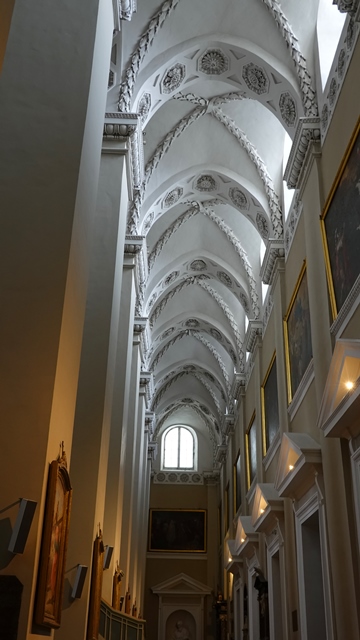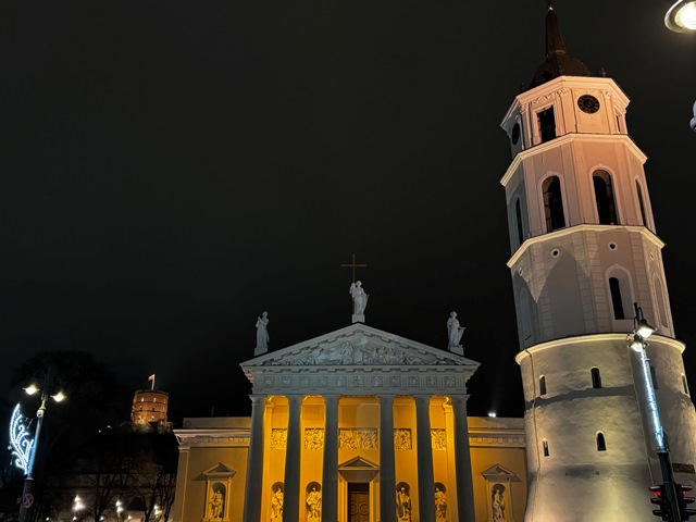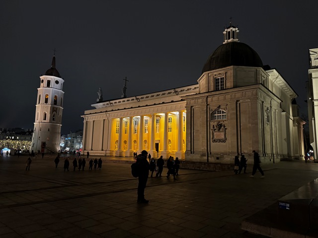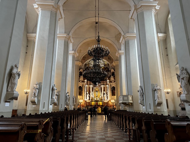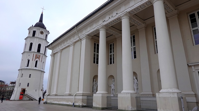Entramos a visitar el interior de la Catedral, principal iglesia católica del país, el actual edificio fue edificado en el siglo XVI, sobre la ruinas de sus antecesoras catedrales destruidas por incendios. Dicha remodelación corrió a cargo del arquitecto lituano Laurynas Gucevičius, dándole el estilo neoclásico en las fachadas.