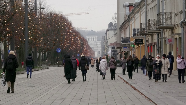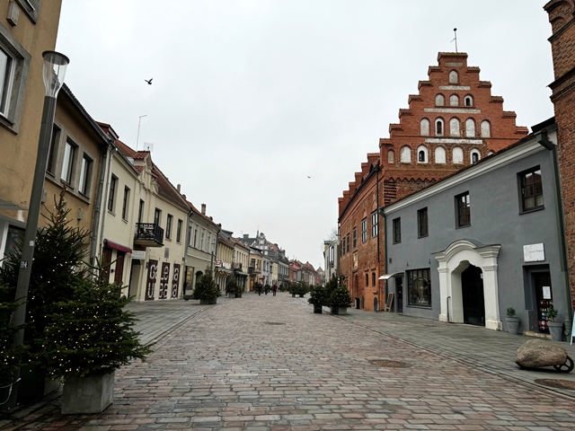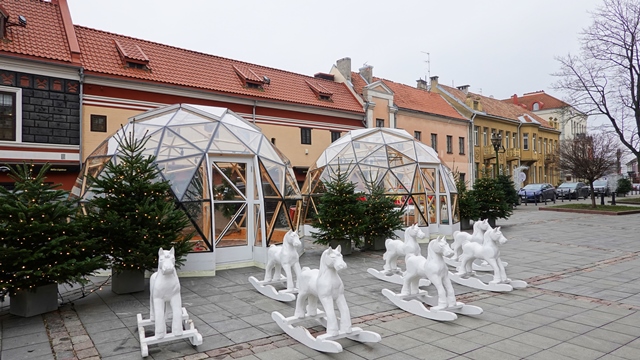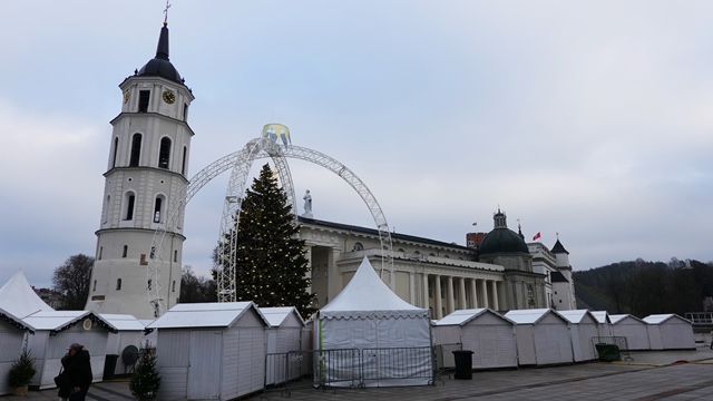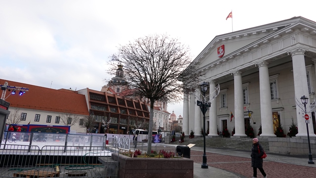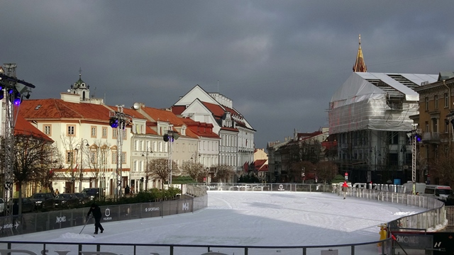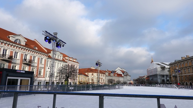 Subiendo por la calle Rotušės llegamos a la Plaza del Ayuntamiento, en la que tenían instalada una pista de patinaje sobre hielo durante las fiestas de Navidad.