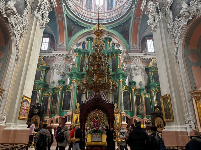 Antes de legar a la Puerta del Alba, visitamos la sorprendente Iglesia ortodoxa del Espíritu Santo, su exterior está pintado con color rosa y blanco con sus cúpulas rosadas. Fue construida en 1750 en estilo barroco, según diseño del arquitecto alemán Johann Christoph Glaubitz.