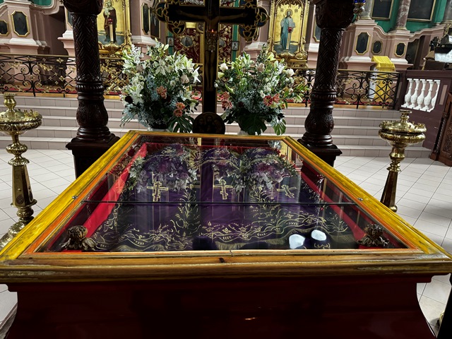 Su colorido interior en verde intenso, hace destacar los marcos de los Iconos y las lámparas doradas, con detalles en estilo rococó. Frente al altar reposan en un relicario los restos de tres santos mártires.