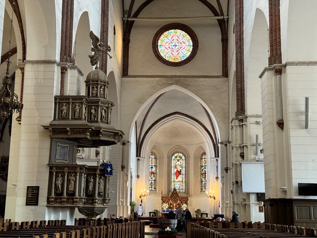Siguiendo con nuestro paseo por el centro histórico pasamos frente a la la encantadora Iglesia de Santa Ana, con una fachada de obra vista roja, fue construida en estilo gótico a finales del siglo XVI sobre los restos de una antigua iglesia de madera que fue destruida por un incendio.