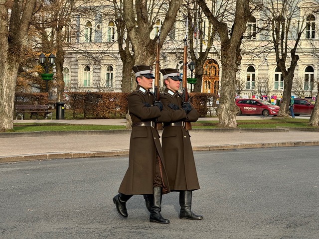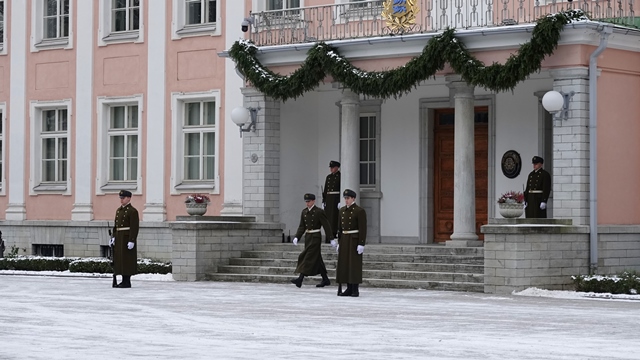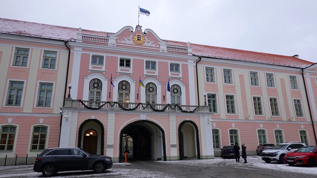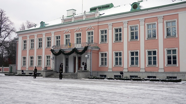 La oficina del presidente es un edificio construido en 1930, situado en las cercanías del Palacio Kadriorg, en mitad del Parque Kadrioru, según diseño del arquitecto Alar Kotli, en un estilo arquitectónico barroco para que no desentonará con el Palacio Kadriorg. Coincidió que era el cambio de guardia cuando llegamos frente a él.