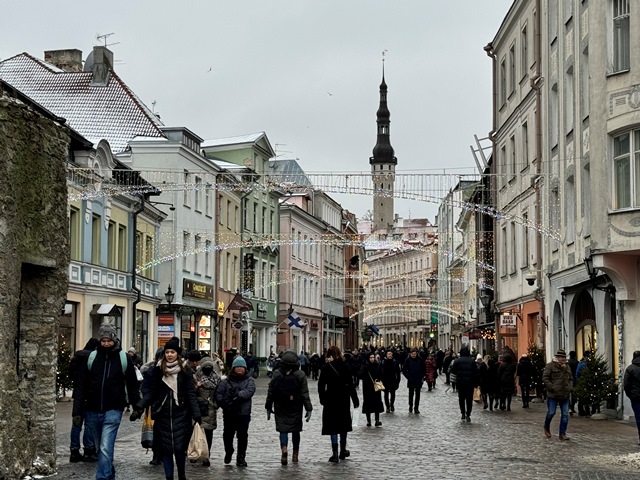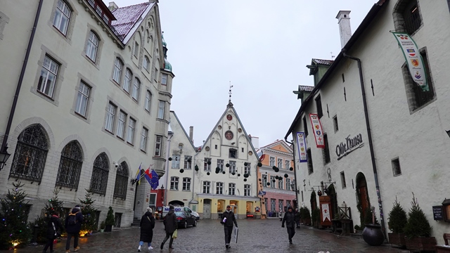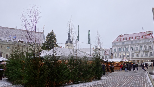 Descendimos hacia la Plaza del Ayuntamiento, donde estaba instalado el mercado de Navidad de la ciudad, destaca el edificio del Ayuntamiento, construido en estilo gótico con su torre que tiene 64 metros de altura, se puede subir a ella aunque nosotros no lo hicimos, en la cúspide de la torre pudimos ver la veleta llamada el Viejo Thomas, símbolo de la ciudad de Tallin.