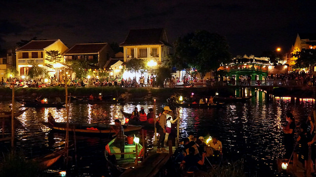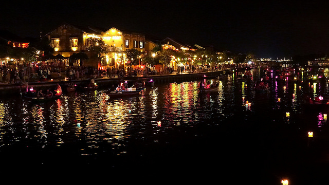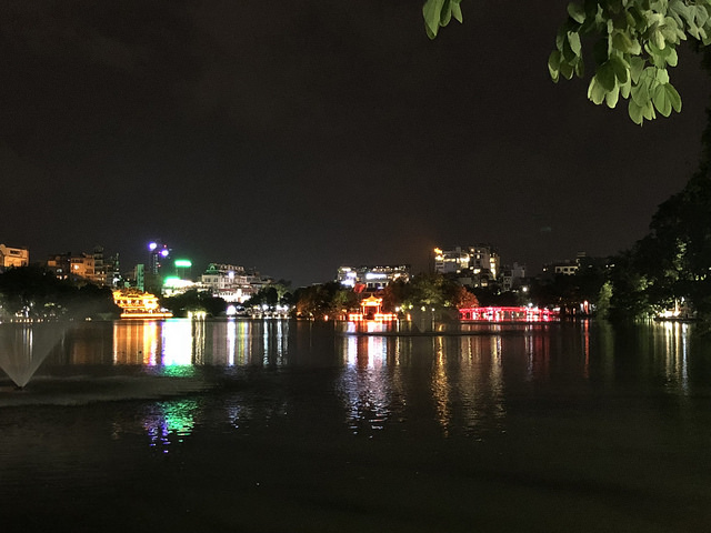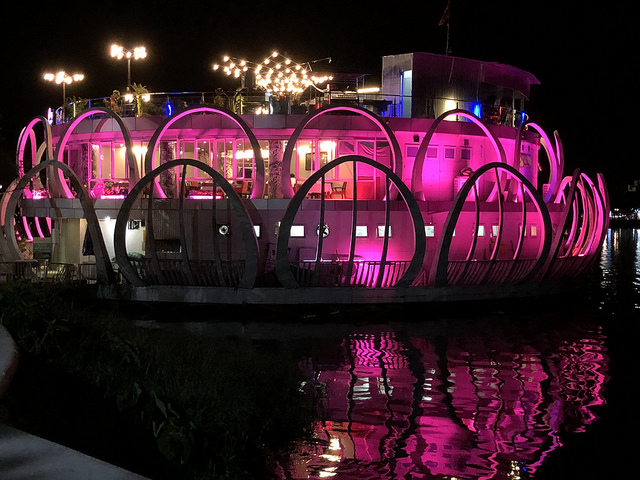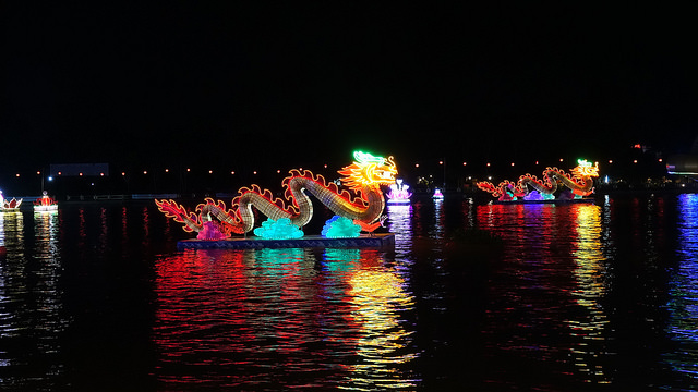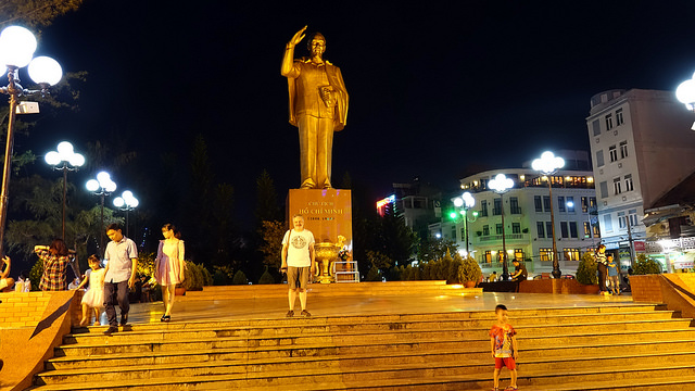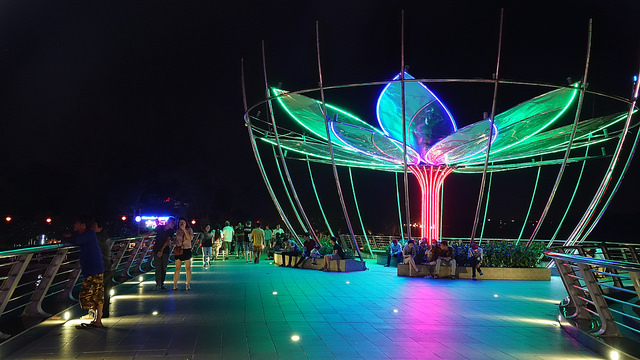 En el paseo nos encontramos con una estatua de Ho Chi Minh y a continuación un puente repleto de luces de neón de muchos colores, alguna figura me recordaba los arboles de Singapur en pequeño y con varias figuras iluminadas flotando en el río también de vivos colores.