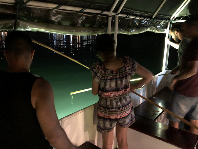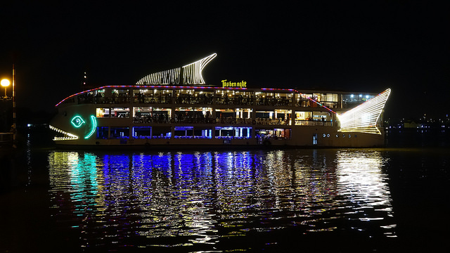 Una vez en el río pasó delante nuestro un barco con miles de luces de colorines simulando una ballena, con una fiesta abordo, mira que les gustan las luces de colores a los asiáticos .