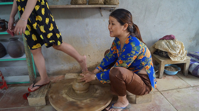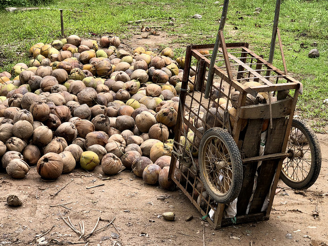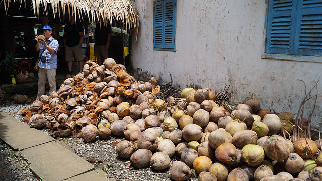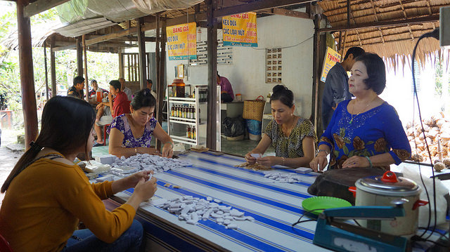 Hicimos un paseo alrededor del río Bến Tre, nos pararon para ver varias industrias, empezamos en una donde hacían ladrillos, la siguiente hacían miel y fruta seca, también visitamos un taller de cocos donde se produce la delicatesen local: dulces de coco y acabamos en una donde se fabricaban de manera artesanal diversos productos hechos con fibra y cáscara de coco, desde alfombras a tapetes.