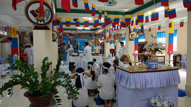 Llegamos al templo Cao Dai, de estilo completamente diferente a los otros, fundado por la secta caodaista, al mirar hacia dentro nos invitaron a entrar y subir a la primera planta donde estaban haciendo algún tipo de ritual con chavales jóvenes, fué bastante interesante, esta secta fue fundada en 1926 por un funcionario llamado Ngo Van Chieu, y dicen recibir revelaciones de los espíritus de Lenin, Juana de Arco, Descartes, Víctor Hugo, Pasteur Shakespeare, Mahoma, Jesús y otros, mezclando varias religiones.