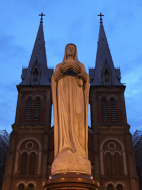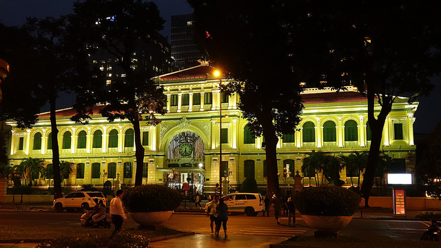 Guiándonos con el maps.me, cruzamos el parque en dirección a la catedral de Notre Dame, construida, como no, por los franceses, estaba en restauración así que no pudimos entrar a verla por dentro, aunque dicen no es ninguna cosa del otro mundo, justo enfrente está el edificio de correos que, al estar anocheciendo, estaba empezándose a iluminar.