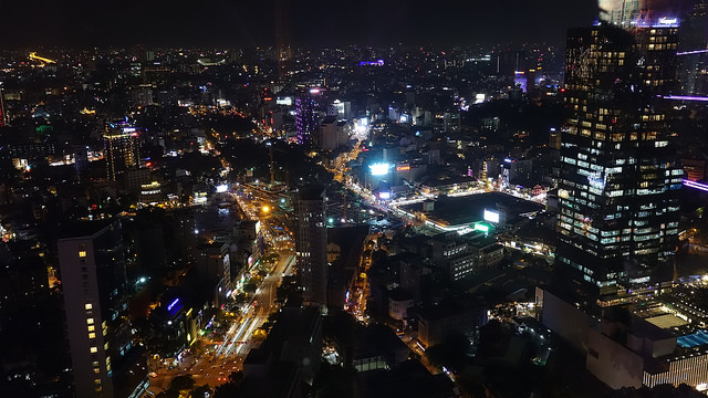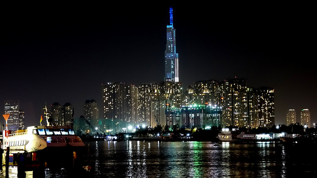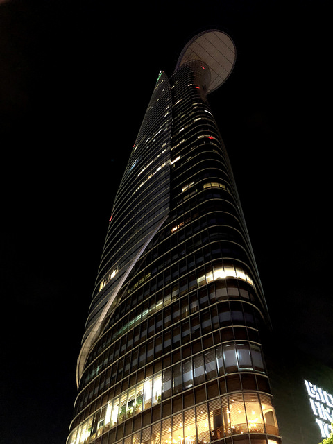 Continuamos por la avenida Dong Khai hasta el centro comercial Parkson Plaza, allí giramos a la derecha hasta el hotel de ville, actualmente ayuntamiento de Saigón, bajamos la rambla peatonal Nguyễn Huệ Pedestrian Street, que está rodeada de edificios iluminados con luces de colores, a mitad de calle hay una fuente también con leds de colores, pero nada que ver con la de Montjuic en Barcelona, seguimos hacia el edificio Bitexco Financial Tower , al cual subimos para ver una panorámica 360 de la ciudad, el precio para poder subir es de 200.000 dar, este edifico fue construido en 2010, con una altura de 262,5 metros y 68 pisos, en su momento fué el más alto de Vietnam. Desde el mirador hay una magníficas vistas del rio y todo su entorno, que al ser de noche, pudimos ver completamente iluminados.