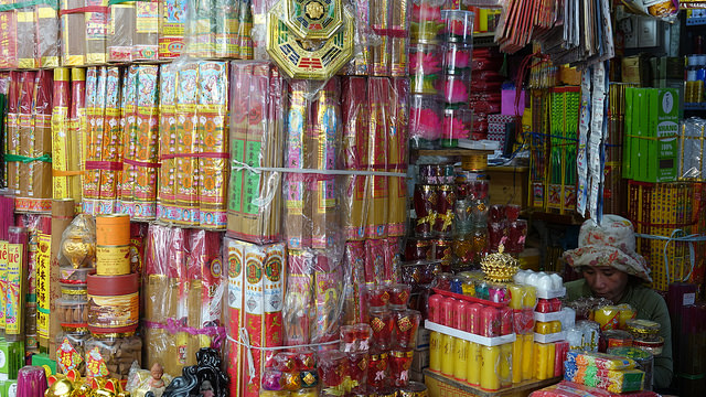 Al salir tomamos la calle lateral pasando frente al edificio de apartamentos Lucky Palace en dirección al primer templo, por el camino nos encontramos con las calles dedicadas a la venta de productos de ferretería, otra calle de tiendas de hierbas medicinales y especias, la verdad es que perderse por estas callejuelas es sumamente interesante.