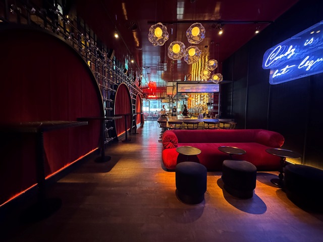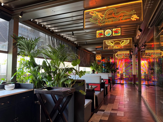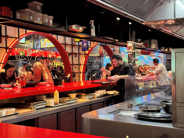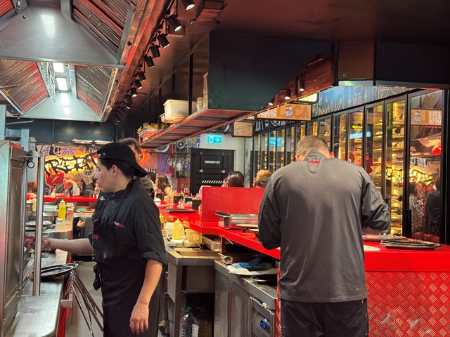 El ambiente del local fue bastante marchoso, con música dance a alto volumen, lo que a veces impedía oír correctamente la descripción de los platos, pero supongo que es la gracia del local, en cuanto a los taburetes de la barra están algo juntos lo que ayuda a crear esa sensación de estar en una barra de comida callejera asiática.