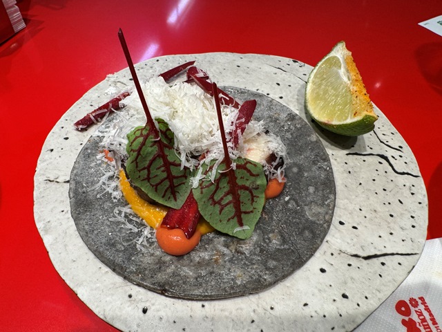 Tako de Pulpo, envuelto en un taco de maíz azul con pulpo gallego a la brasa, mole amarillo de chile morita y mantequilla, emulsión de tomatillo de árbol, zanahorias encurtidas, queso parmesano y pipas de calabaza.