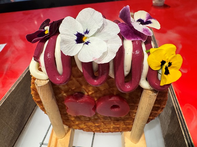 Milhoja de waffle helado de caramelo de violetas y nata a la vainilla de Madagascar, decorado con violetas y vainilla.