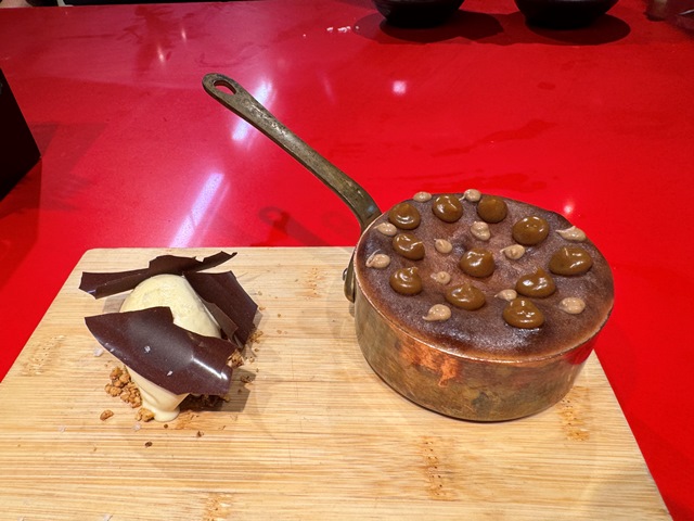 Soufflé líquido de avellana con núcleo de chocolate y chile a la brasa con tamarindo y helado de mantequilla noisette.
