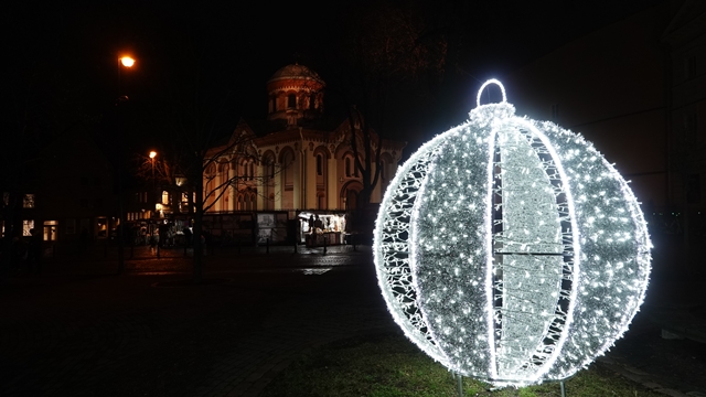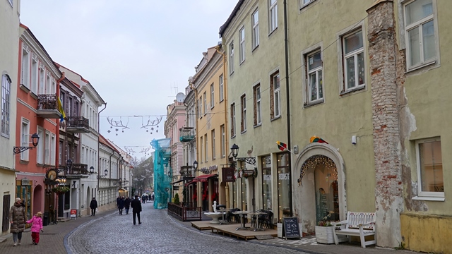 Las calles principales mejor iluminadas son la Calle Pilies, la más larga de la ciudad, que fue donde estaba el restaurante donde almorzamos y la calle Didžioji, la que lleva a la plaza del ayuntamiento donde hay los edificios más hermosos.