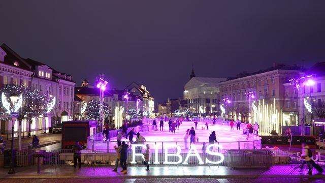 Subiendo por la calle Rotušės llegamos a la Plaza del Ayuntamiento, en la que tenían instalada una pista de patinaje sobre hielo durante las fiestas de Navidad.