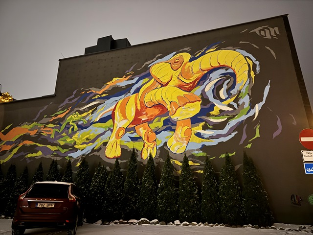 Pasamos frente el mural conocido como «Latvijas pilsētas un novadi valsts simtgadei», donde están representados los escudos de todas las ciudades y las regiones de Letonia, realizado durante la celebración del centenario del país, se encuentra en una esquina de la calle Smilšu iela.