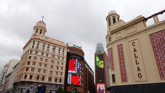 De la Puerta del Sol subimos por la Calle Preciados hasta llegar a la Plaza del Callao, situada junto a la Gran Via, en esta plaza se reúnen varios e inmensos letreros luminosos, muy al estilo del Piccadilly Circus londinense.