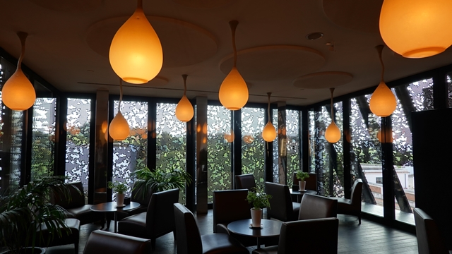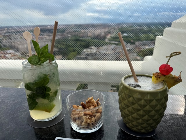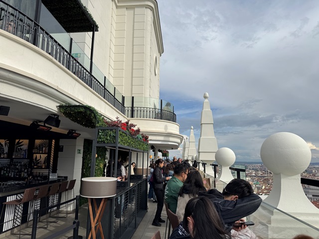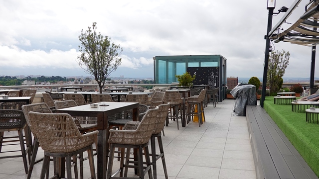 Desde el pequeño hall trasero, tomamos el ascensor que nos llevo hasta lo más alto del edificio. Al llegar a la terraza nos sentamos en uno de los taburetes que dan a la plaza para tomar un coctel y disfrutar de las vistas.