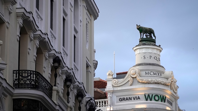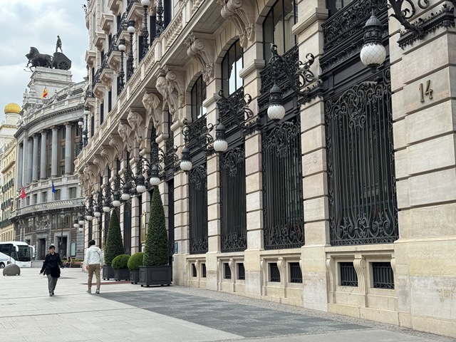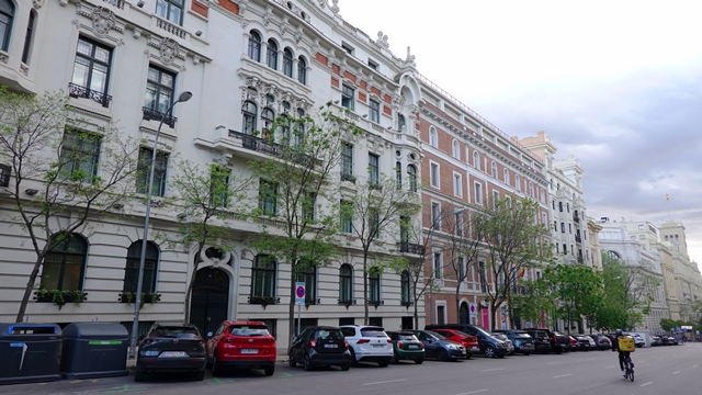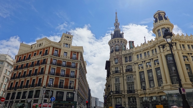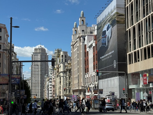Desde la plaza de España subimos por la Gran Vía, gracias a su gran anchura ofrece una excelente perspectiva de los elegantes edificios que la flanquean.