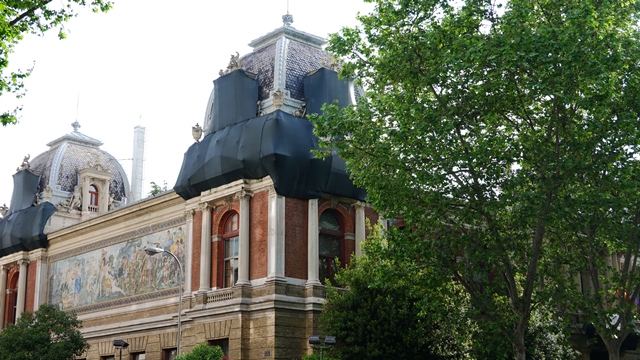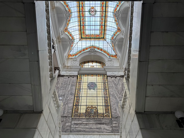 Una vez entramos, que es de acceso gratuito, subimos por unas escaleras monumentales de mármol de Macael para llegar a la inmensa sala principal del Museo, frente a la escalera y en el techo pudimos ver una gran vidriera donde aún se mantiene el emblema de la II República española.