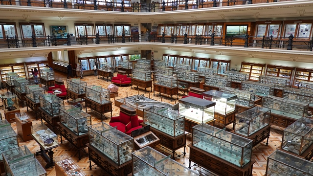 En la planta baja pudimos ver decenas de vitrinas expositoras de madera tallada, que aún son las originales de cuando se inauguro el museo, todas ellas repletas de minerales y fósiles. No es de los museos más conocidos pero a nosotros nos encantó, tanto el edificio como la exposición.