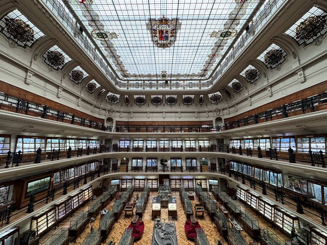 Al entrar a la sala principal, nos quedamos boquiabiertos, es una preciosidad, parece sacada de una película, se trata de una inmensa nave rectangular de casi 800 m² por 19 m de altura, con una gran vidriera de colores en el techo con el escudo de la casa Real en el centro, elaborada por la Casa Maumejean Hermanos.