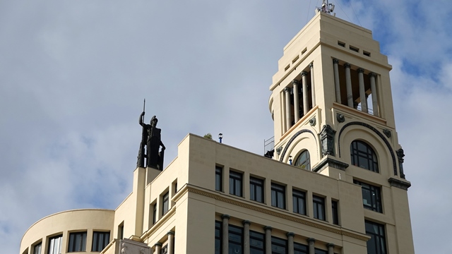 Rodeando la plaza se puede disfrutar de la vista de emblemáticos edificios como la Torre de Madrid, con sus 142 metros de altura, la Casa Gallardo , el edificio de la Compañía Asturiana de Minas y el Edificio de España al que subiríamos de inmediato.