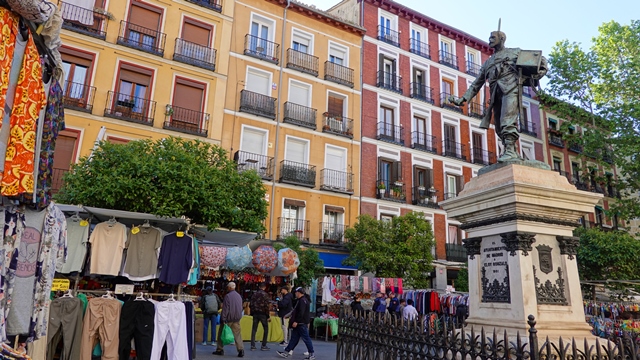 Para tener una vista con un poco de altura subimos a las Nuevas Galerías del Rastro, que tiene una terraza con vistas sobre las paradas del mercado. Calle arriba nos encontramos con el Monumento a Eloy Gonzalo el Héroe de Cascorro, rodeado de paradas de ropa. Destinamos media mañana en explorar el mercado del Rastro.
