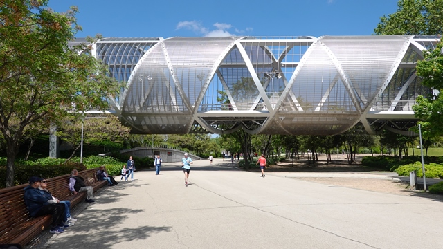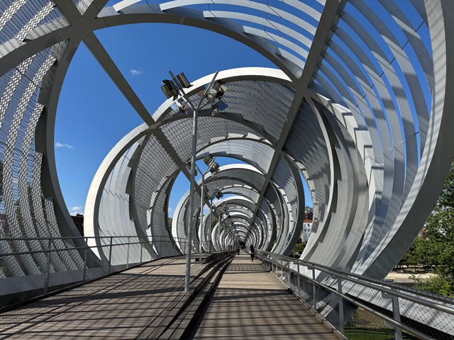 Cruzamos el río por el Puente monumental de Arganzuela, un moderno y original puente de acero inoxidable con 150 metros de longitud, obra del arquitecto francés Dominique Perrault.