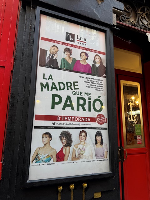 Adquirimos estradas para ver la obra La madre que me parió que se representa en el Tetro Lara, un hermoso teatro construido en 1879 gracias a don Cándido Lara, de quien tomó el nombre, está considerado uno de los teatros más bonitos de la Comunidad de Madrid, también conocido como la “Bombonera de Don Cándido” , se encuentra en la calle Corredera Baja de San Pablo, 15.