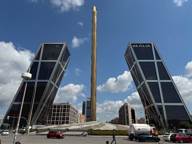 Caminamos hacia la Plaza de Castilla, donde se encuentran los edificios llamados la Puerta de Europa, aunque yo siempre las llamo con el nombre original las Torres Kio, los sorprendentes rascacielos inclinados de 115 metros de altura, símbolo del auge económico inmobiliario de inicios del siglo XXI.