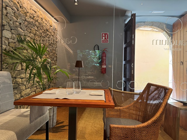 El restaurante está ubicado en un edificio singular del casco antiguo con gruesos muros de piedra, una amplia sala con decoraciones rústicas y un bello lucernario al fondo de la sala con plantas en su interior.
