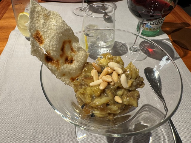Tartaleta de Berenjena Blanca de Altafulla escalivada, bombones de pera confitada y leche de piñones.