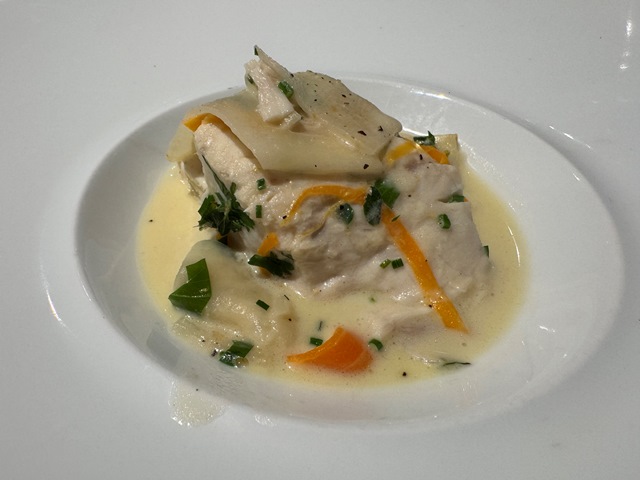 Lubina a la nage de jugo de berberechos con verduritas y hierbas aromáticas en caldo corto.