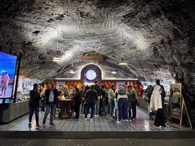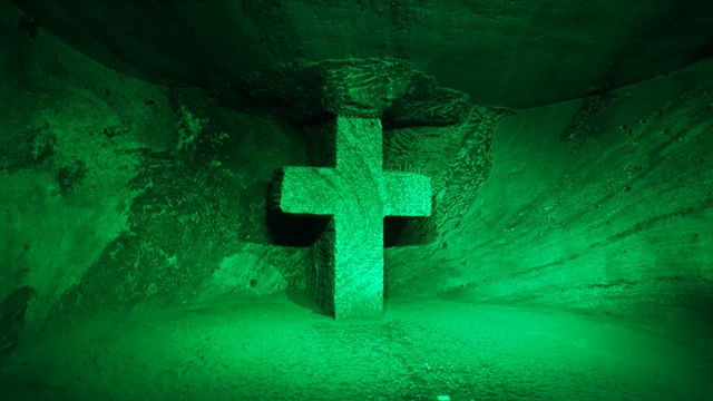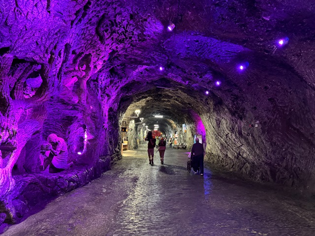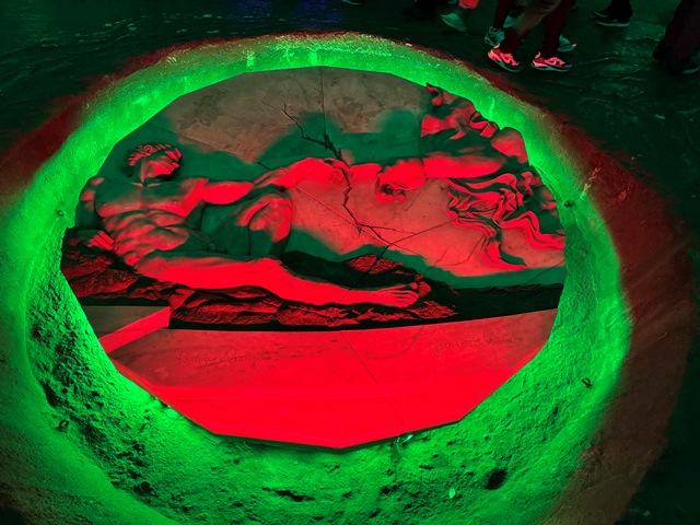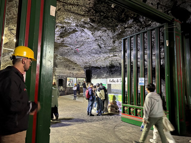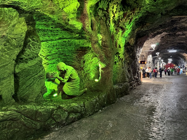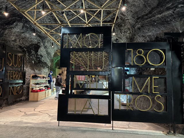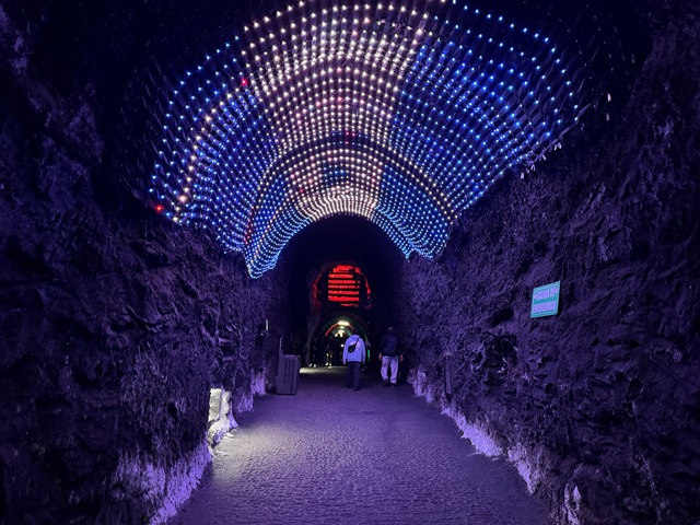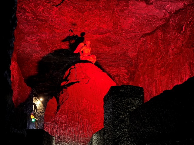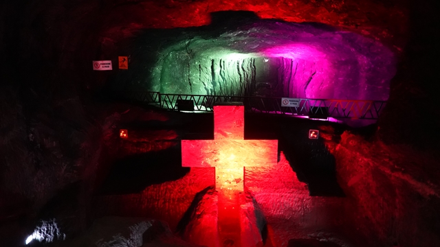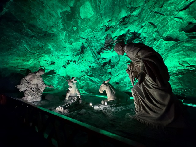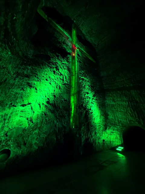 Una vez llegamos, accedimos a la mina acompañados de un guía en pequeños grupos, al inicio nos encontramos con un túnel iluminado con leds de colores hasta llegar al viacrucis, con sus 14 estaciones representando la Pasión de Cristo.