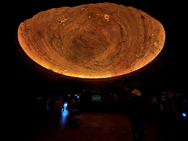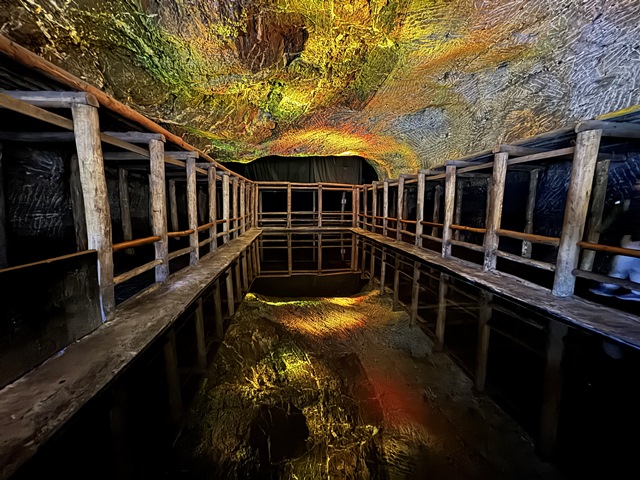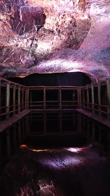 El Espejo del Agua, un pequeño lago de agua con la sal disuelta conocida como salmuera, que crea un efecto acompañado de la iluminación, similar al de un espejo en el que se refleja la el techo de roca simulando que hubiera un agujero profundo en la tierra.