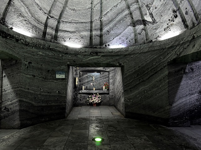 En la zona del coro, dispone de un balcón para ver las amplias salas , donde se encuentra la cruz bajo tierra más grande del mundo, de 16 metros de alto por 10 de ancho.