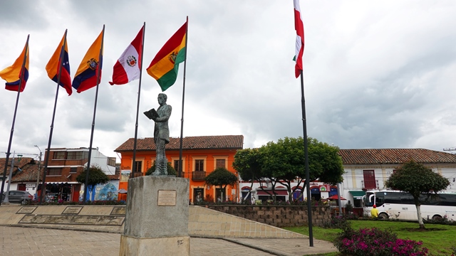Nos desplazamos por la comercial calle 5 hasta la plaza de la independencia, inaugurada en 2010, donde pudimos ver una estatua de Antonio Nariño precursor de dicha independencia, junto con las cinco banderas de las naciones de la conquista bolivariana.