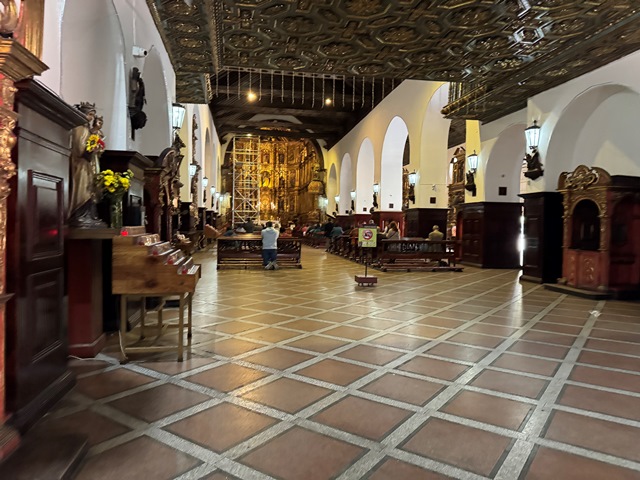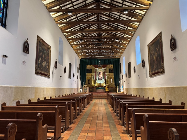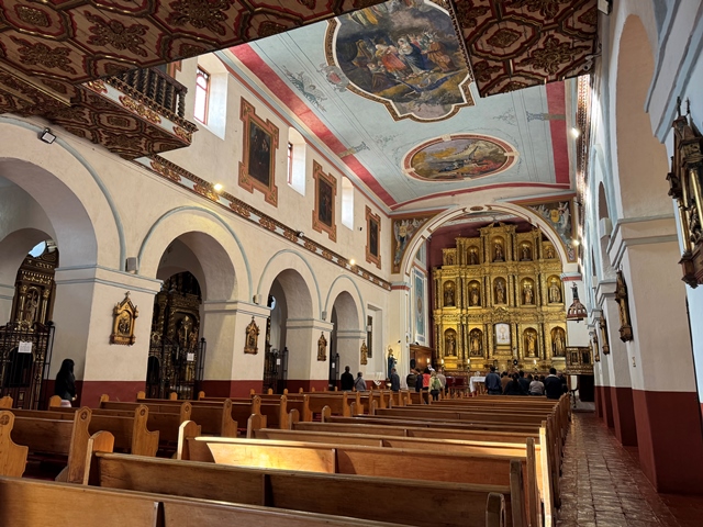 De su interior destacan el dorado y espectacular altar mayor del siglo XVII y varios murales de Pedro Alcántara Quijano Moreno.